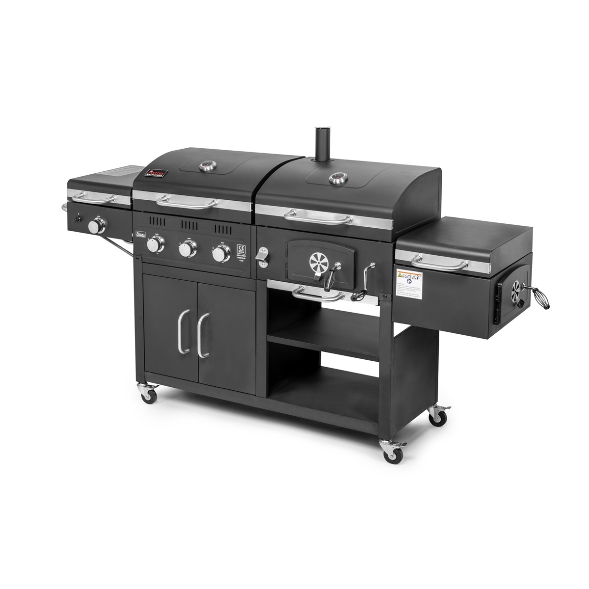 Někdy je pohodlí plynového grilu velkou výhodou, jindy by zase dal člověk přednost romantice přípravy pokrmů na dřevěném uhlí. Díky grilu Activa Combo už nemusíte volit kompromis. Tento velký gril disponuje jak částí plynovou, tak i částí, ve které se griluje na dřevěném uhlí. Podle druhu pokrmu nebo čistě podle nálady a počtu strávníků, se můžete rozhodnout mezi jednou nebo druhou částí, popřípadě přípravě jídla paralelně na obou částech. Aby byla výbava dokonalá, disponuje tento gril 2 bočními vařiči. Jedním na dřevěné uhlí a druhým s moderním keramickým infračerveným hořákem, který se dokáže rychle rozpálit až na 800°C a je skvělý na přípravu steaků a dalších mas, uvnitř šťavnatých, na povrchu skvěle upečených. Navíc nemusíte kvůli přípravě masa rozpalovat celý gril. Plynová část grilu má tři moderní nerezové hořáky s horním krytem, díky kterému je odkapávající tuk veden mimo plamen a odveden do speciální nádržky. Pokrm tak bude vždy zdravý bez zbytečných škodlivých prvků, které vznikají přepalováním tuku. Hořáky se pohodlně zapalují pomocí piezo zapalování integrovaného v otočných knoflících. Gril je dále vybaven kvalitním dvoudílným litinovým roštem se smaltovaným povrchem, který obsahuje vyjímatelnou kruhovou výseč, místo které můžete na grill vložit třeba pánev wok nebo jiné příslušenství. Část na dřevěné uhlí je rovněž tvořena kvalitním smaltovaným roštem s vyjímatelnou kruhovou částí z litiny. Část s rozžhaveným uhlím se dá jednoduchou kličkou jednoduše oddalovat nebo přibližovat k roštu a tím regulovat intenzitu žáru. Obě části grilu obsahují i další vyklápěcí rošt, který je vhodný na nepřímé grilování masa či zeleniny anebo na ohřívání již ugrilovaných pokrmů. Gril má kvalitně lakovaná víka s velkými nerezovými madly a zabudovaným teploměrem, několik odkládacích poliček, integrovaný otvírák na lahve a praktický odkládací prostor pod grilem přístupným dvířky zepředu. Pro snadný transport je vybaven čtyřmi kolečky. Na rozdíl od mnoha jiných grilů je již v základu vybaven vším potřebným pro připojení k plynové lahvi 5 nebo 10 kg.