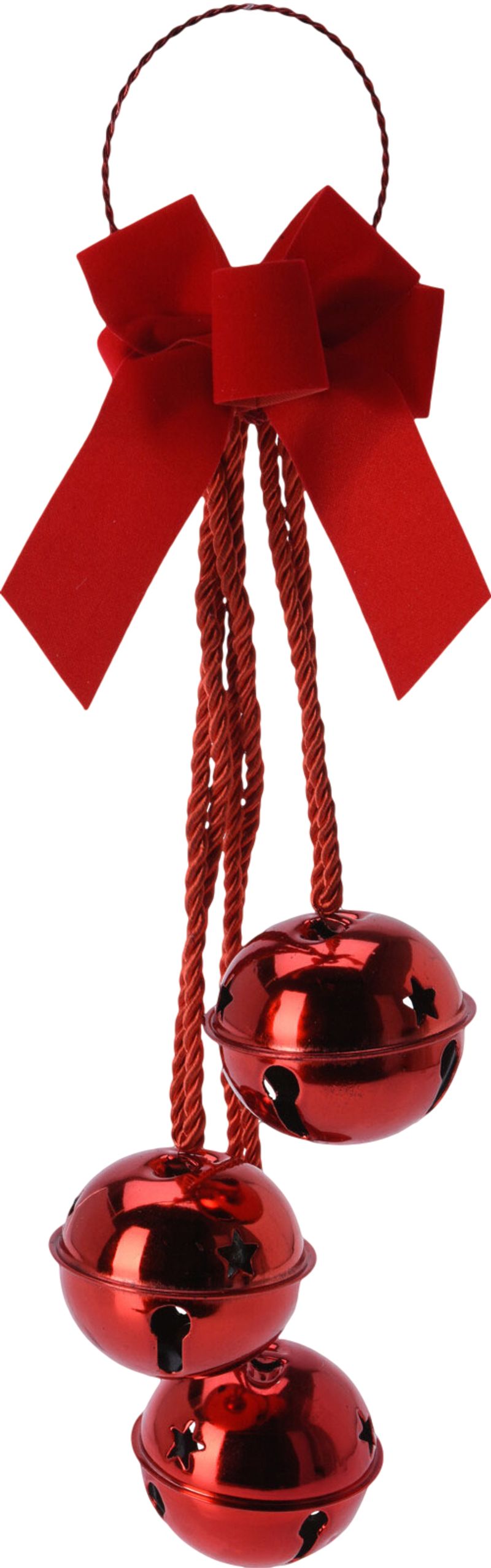 Elegantná vianočná dekorácia Zvončeky na dvere v červenej farbe dodá vášmu domovu sviatočný pôvab a decentný lesk. Tri kovové zvončeky zavesené na ozdobnej šnúrke a doplnené mašľou vytvárajú harmonický a vkusný doplnok, ktorý privíta vašich hostí jemným cinkaním.