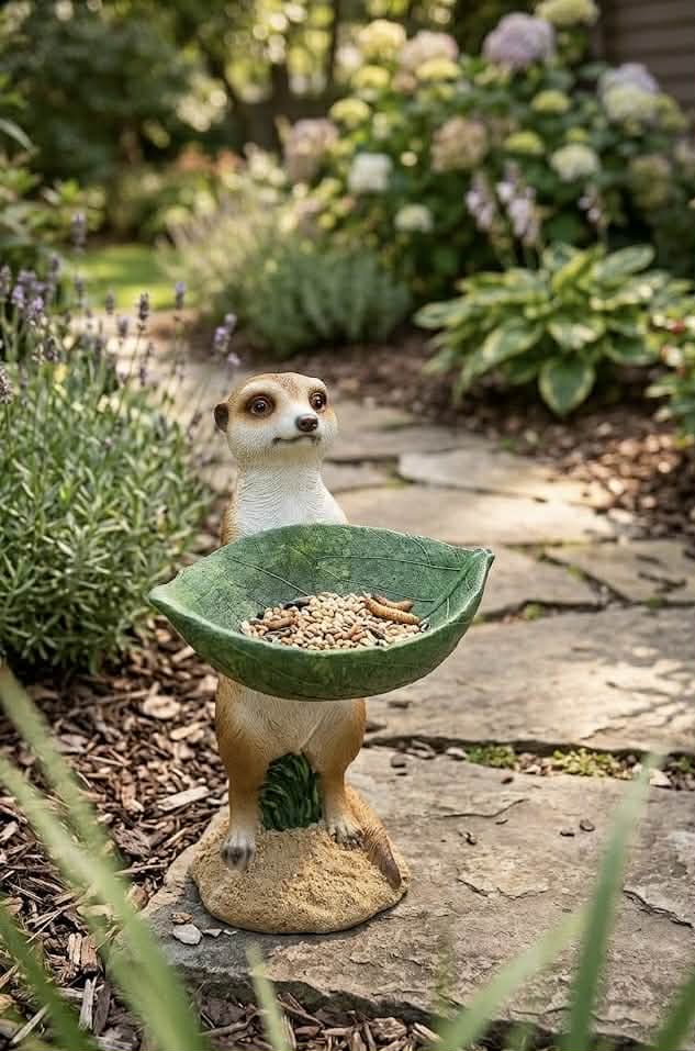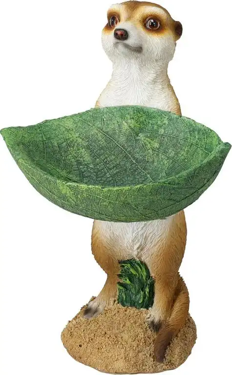 Záhradná dekorácia – postavička stojatá surikata s miskou v dizajne listu, čo v zime môže slúžiť ako kŕmitko na rôzne semiačka a v lete zas ako napájadlo pre vtáky.