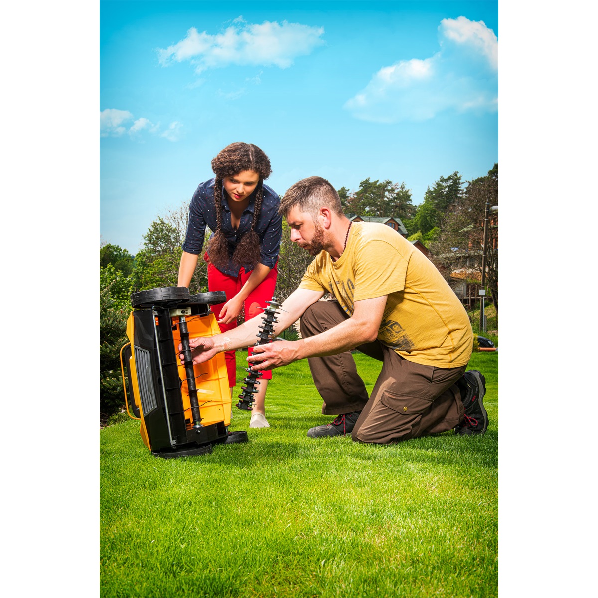 - Široký vyhadzovací tunel stroj je vybavený dvoma ľahko vymeniteľnými valcami – valcom s drôtikmi na vyčesanie starej trávy, burín, machov a pod. a valcom s nožmi, ktorý navyše profrézuje pôdu ešte viac do hĺbky