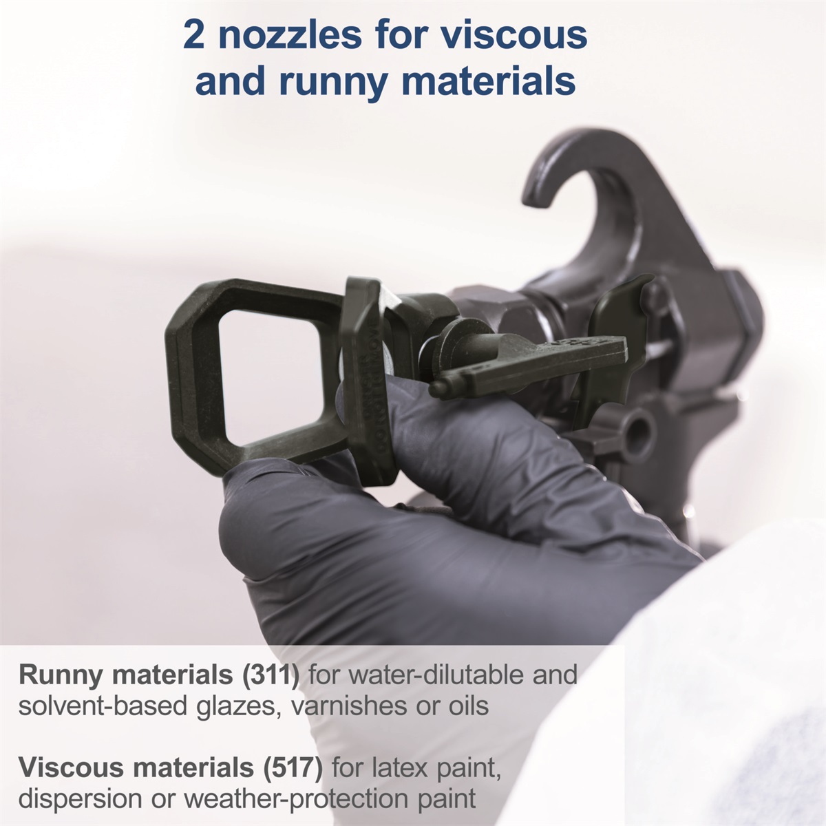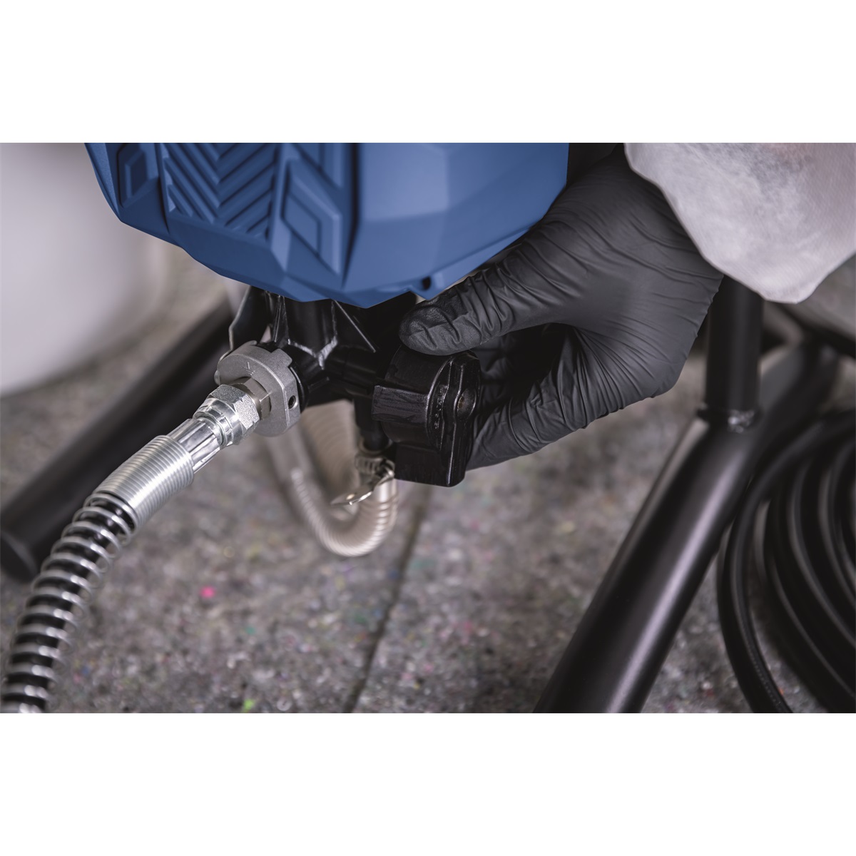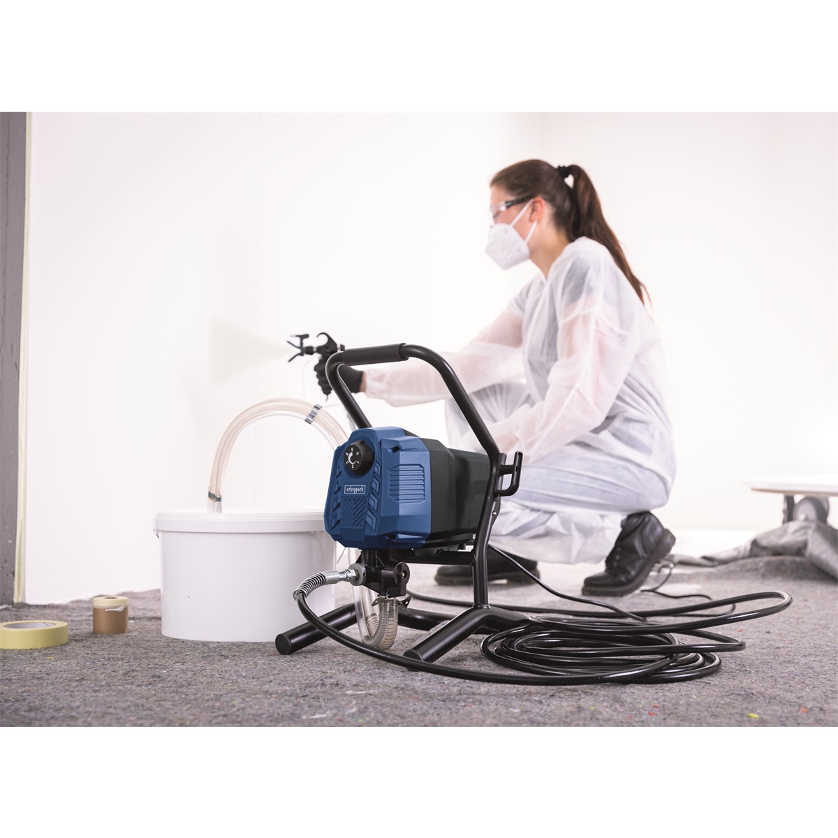 Scheppach ACS 4000 je praktické a kompaktní vysokotlaké bezvzduché stříkací zařízení s technologií Airless s přímým nasáváním a plynulou regulací tlaku. Dovoluje velmi rychle a rovnoměrně nastříkat hladké i texturované plochy, jako jsou interiérové stěny, stropy, zahradní ploty, přístřešky, zídky apod. Stroj má vlastní nasávací hadici s filtrem, takže může nasávat barvu z kbelíku nebo přímo z nádoby, ve které jste jí koupili. Není nutné žádné přelévání nebo doplňování do speciální nádržky. Stroj má dlouhou stříkací hadici 9 m, což dovoluje velký akční rádius bez nutnosti posouvání zařízení. Stříkací hadice je zakončena lehkou stříkací pistolí s velkým spínačem na 4 prsty a s možností aretace, což výrazně snižuje únavu ruky při déletrvající práci. Stříkací pistoli lze nastavit jak pro svislý, tak i vodorovný směr malby. Pro snadné přenášení je stroj vybaven praktickou rukojetí. Zařízení obsahuje dvě trysky jak pro viskózní, tak i tekuté materiály a je tak vhodné pro viskózní nebo tekuté barvy, latex, laky a vodou ředitelné lazury, nátěry proti povětrnostním vlivům, mořidla apod. Výkonný motor s měděným vinutím je uložen v pevném rámu, který má integrovaný úložný prostor pro trysky a díky průtoku až 1,25 l/min lze postupovat rychlostí až 420 m2 za hodinu, což je až 4x rychleji než při ručním malování. Stroj umožňuje jednoduché nastavení tlaku a rovněž snadné přepínání mezi režimem předplnění barvy a samotným stříkáním. Kompaktní rozměry usnadňují transport i skladování.