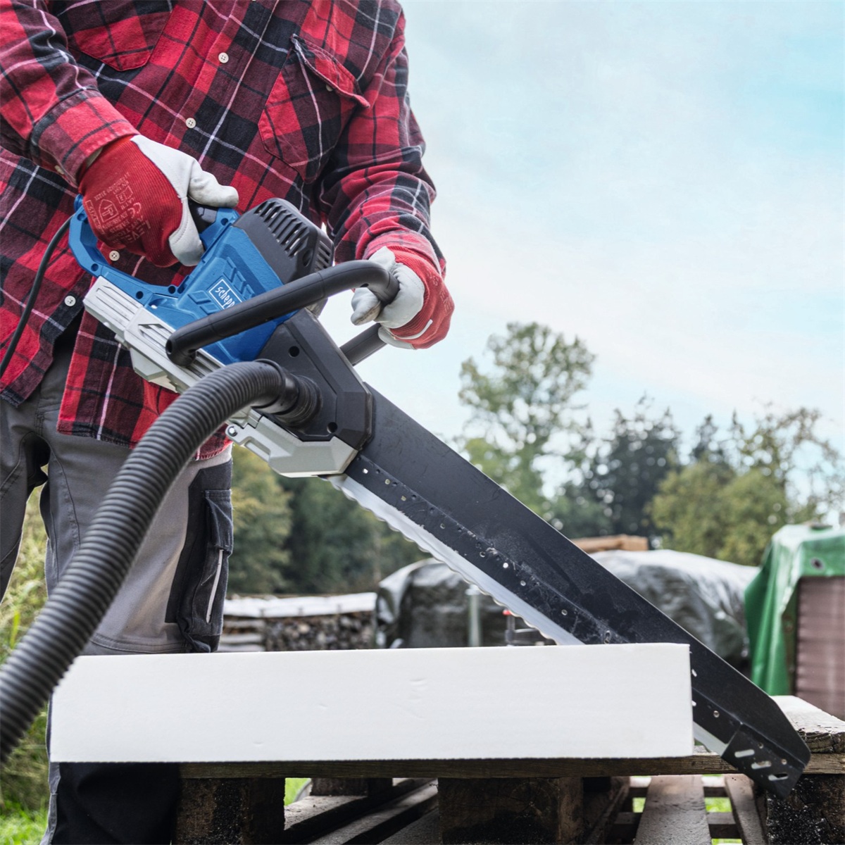 Scheppach AZE 430 je univerzální stroj s robustní konstrukcí a silným motorem 1500 W, který si bez problémů poradí s cihlami, pórobetonovými tvárnicemi, izolační vatou i dřevem. Díky tomu nabízí rychlý, rovnoměrný a přesný řez i při práci s rozměrnými bloky, což oceníte při zdění příček, úpravách stavebních dílců nebo montážních pracích.