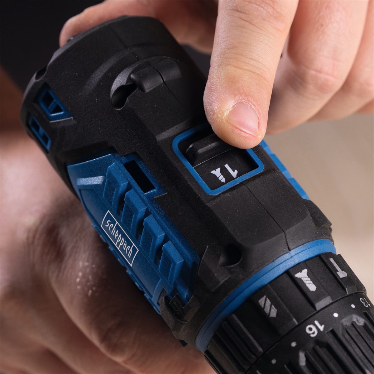 K dispozici je 19 úrovní točivého momentu, 1 úroveň pro vrtání a 1 pro příklepové vrtání, což umožňuje přizpůsobit provoz konkrétním požadavkům a materiálům. Plynulou regulaci otáček zajišťuje pohodlný spínač a rychlé přepnutí mezi jednotlivými funkcemi provedete jednoduchým pootočením kruhového ovladače.