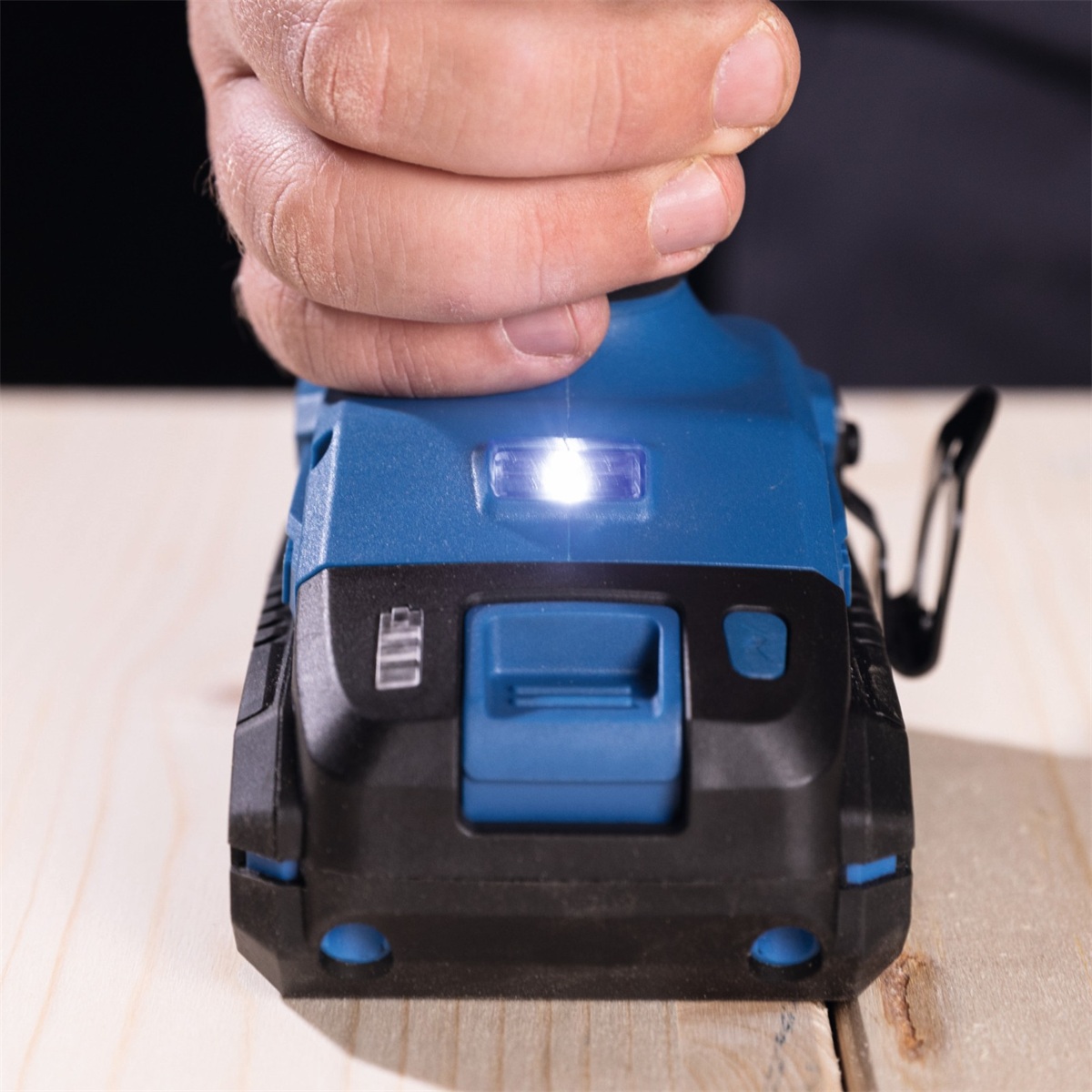 Kvalitní rychloupínací kovové sklíčidlo s automatickým zámkem vřetene pojme vrtáky a bity o průměru 1,5–13 mm. Praktické LED pracovní světlo s funkcí osvětlení po dobu 10 sekund po vypnutí nástroje zajistí dostatek světla i v tmavých prostorech. Díky integrovanému klipu na opasek je vrtačka ideální i pro práci na žebříku nebo ve výškách.