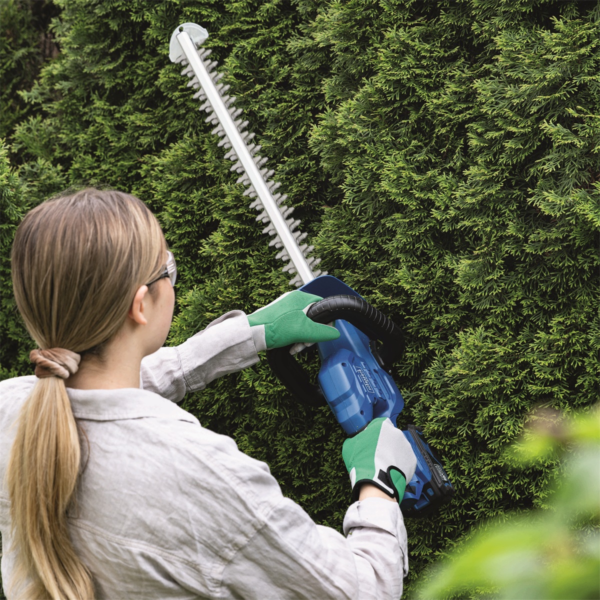Nůžky jsou vybaveny výkonnou čepelí o délce 560 mm, která nabízí 2400 střihů za minutu a umožňuje tak přesný střih až do délky 510 mm. Jsou vhodné pro větve do průměru 16 mm, což z nich činí ideální nástroj pro pravidelnou údržbu zahrady. Ergonomické rukojeti s měkkým povrchem zaručují pohodlné držení a snadnou manipulaci. Součástí balení je ochranný kryt na lištu, který usnadňuje bezpečné skladování. Navíc mají nůžky integrovaný držák pro zavěšení na zeď, takže se dobře skladují. Tyto akumulátorové nůžky na živý plot vám usnadní zahradní práce a zaručí skvělé výsledky při minimálním úsilí.