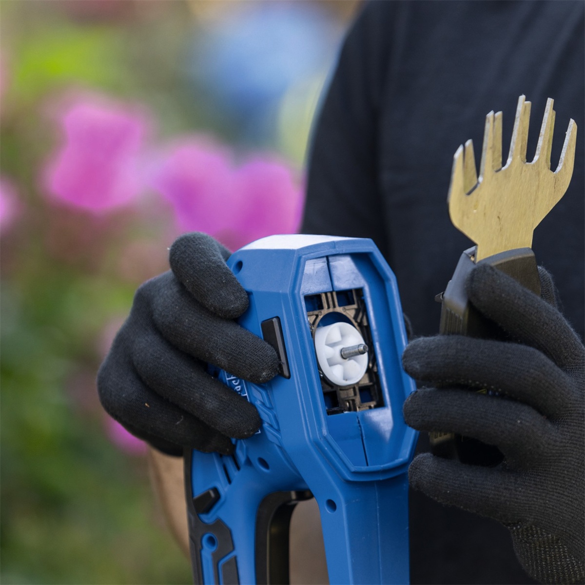 Nůžky nabízejí snadnou výměnu střižných lišt díky chytrému systému, u kterého nepotřebujete žádné nářadí. To umožňuje rychlý přechod mezi stříháním trávy a keřů. Šířka čepele pro trávu je 90 mm, což zaručuje přesnou úpravu trávníkových okrajů. Čepele pro keře s délkou střihu 200 mm se postarají o snadnou a přesnou péči o keře a živé ploty. Kvalitní tvrzené čepele zajišťují perfektní řez a dlouhou životnost.
