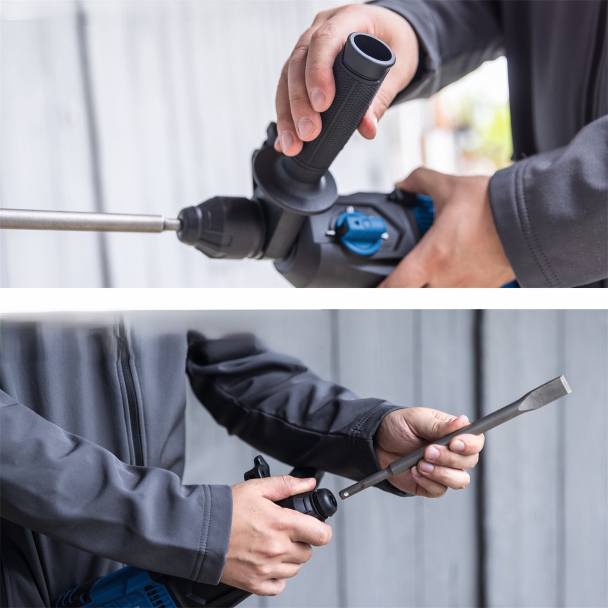 Pro maximální komfort a bezpečnost je kladivo vybaveno přídavnou rukojetí otočnou o 360°, která zajišťuje pevný a jistý úchop v jakékoli pracovní poloze. Ergonomický a kompaktní design s měkčeným povrchem rukojeti přispívá k pohodlné manipulaci i při delší práci. Upínací systém SDS-Plus umožňuje rychlou a snadnou výměnu vrtáků a sekáčů bez zbytečných prostojů.
