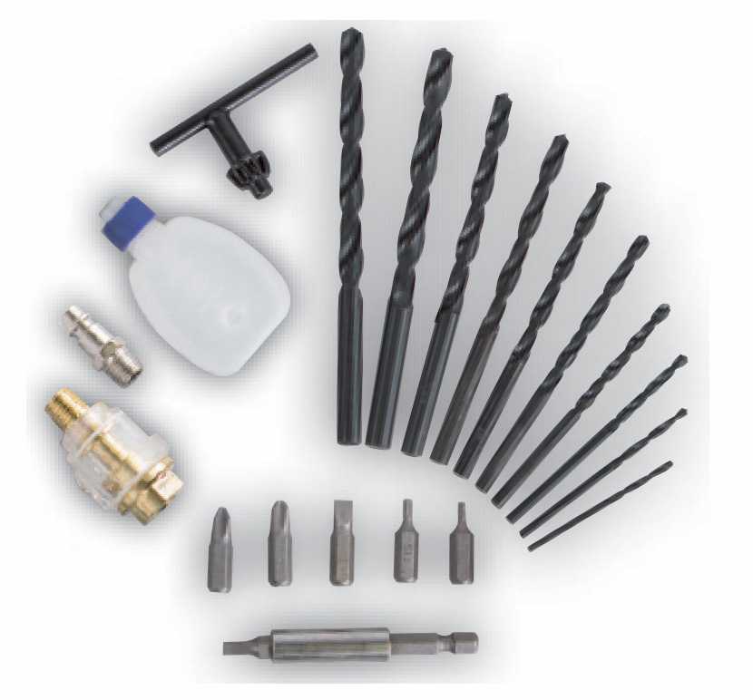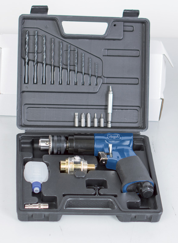 příslušenství: 10 x HSS vrták, 6 x CrV bit, 1 x držák bitů, maznička, olej, sklíčidlo, konektor pro rychlospojku, olejový přimazávač vzduchu