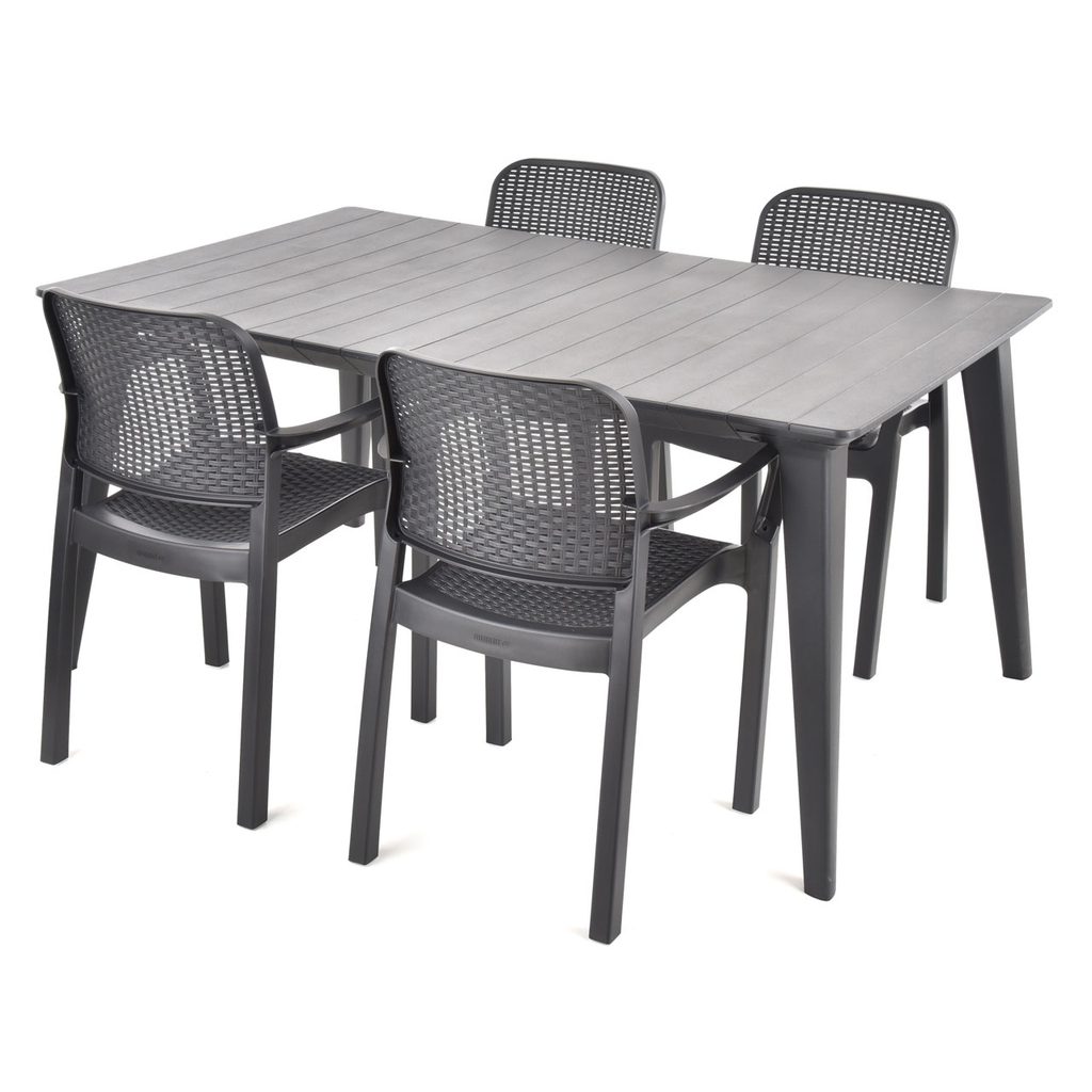 Set 4 stoličiek a 1 stola vyrobených z veľmi odolného plastu. Vhodné do exteriéru aj interiéru. Vhodné aj pre použitie vo vlhkom prostredí. Odoláva nepriaznivým poveternostným podmienkam a UV žiareniu. Veľmi jednoduchá údržba a čistenie. Rozmery stola (ŠxHxV) 157 x 98 x 74 cm. Rozmery stoličky (ŠxHxV) 50 x 59 x 84 cm. Max. nosnosť kresla 120 kg.