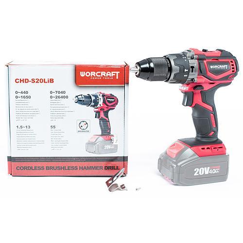 Bezuhlíkový skrutkovač Worcraft CHD-S20LiB s upínacím priemerom 13 mm je určený na vŕtanie do dreva, kovu, keramiky, plastu a betónu. Taktiež je vhodný na skrutkovanie a rezanie závitov. Skrutkovač pracuje maximálnou rýchlosťou 1650 otáčok/min. Je vybavený elektronickou reguláciou otáčok. Otáčky je možné regulovať otáčaním doľava/doprava. Skrutkovač s maximálnym počtom príklepov 26400 bpm poskytuje maximálny krútiaci moment 55 Nm. Disponuje možnosťou nastavenia krútiaceho momentu v 21 krokoch, čo slúži k tomu, aby sa zabránilo poškodeniu hláv skrutiek alebo vrtákov. Otáčaním regulačného gombíka je možné nastaviť krok od 1 (skrutky s ľahkým otáčaním) po 21 (skrutky s ťažkým otáčaním alebo náročné vyvrtávanie). Nastavenie so znakom vrtáku sa používa pre vyvrtávanie.Akumulátor a nabíjačka nie sú súcastou balenia!