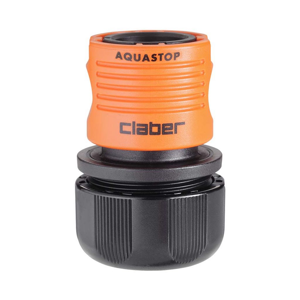 Quick-Click spojka Claber 8604 so systémom Aquastop, ktorá umožňuje pripojiť a odpojiť príslušenstvo na konci hadice bez toho, aby ste museli uzavrieť prívod vody. Odolná voči UV žiareniu a vysokému tlaku vody až do 40 bar, neobsahuje kovové časti.
