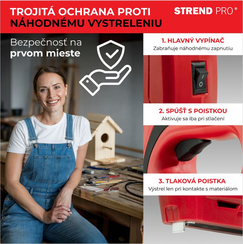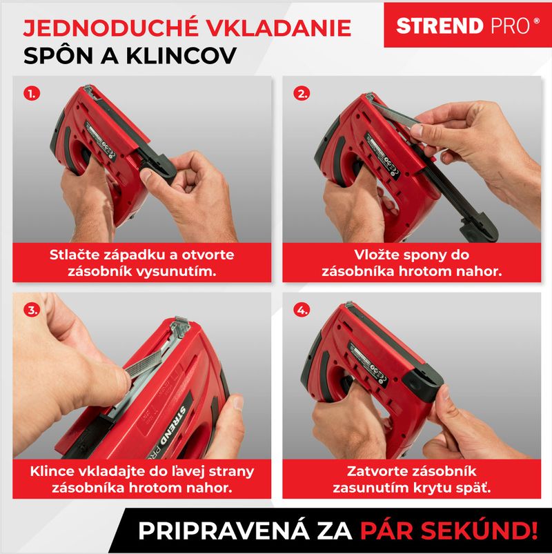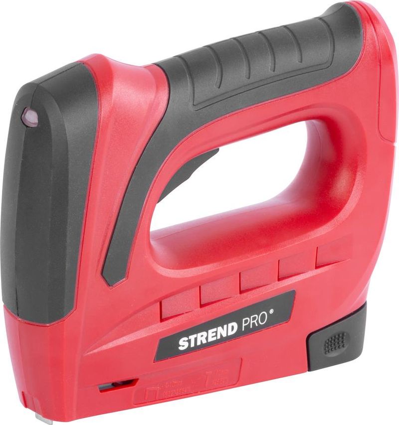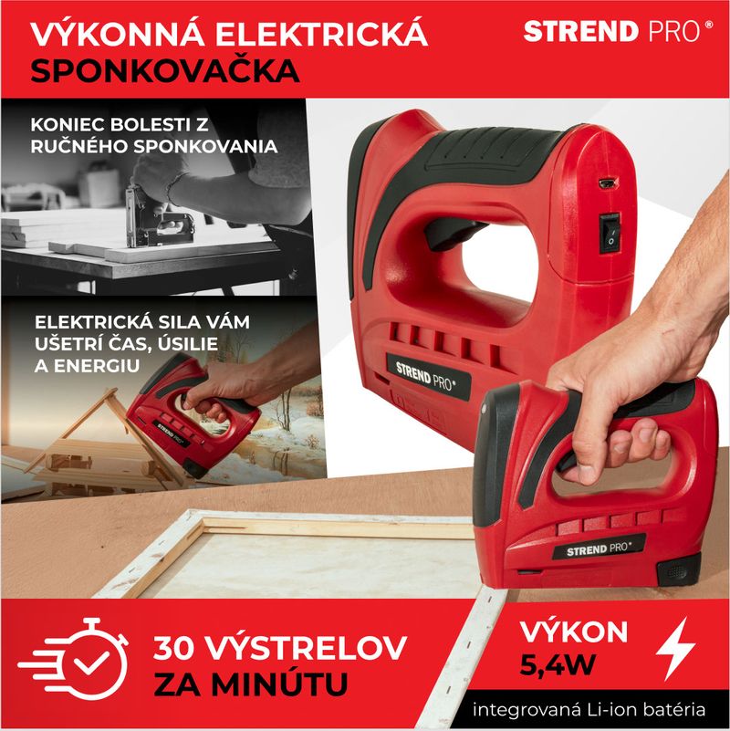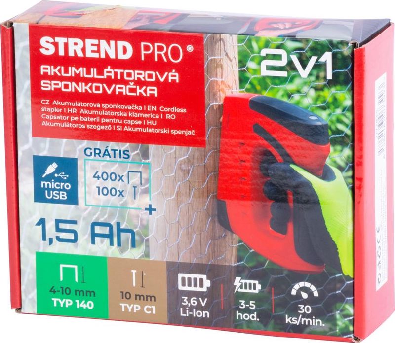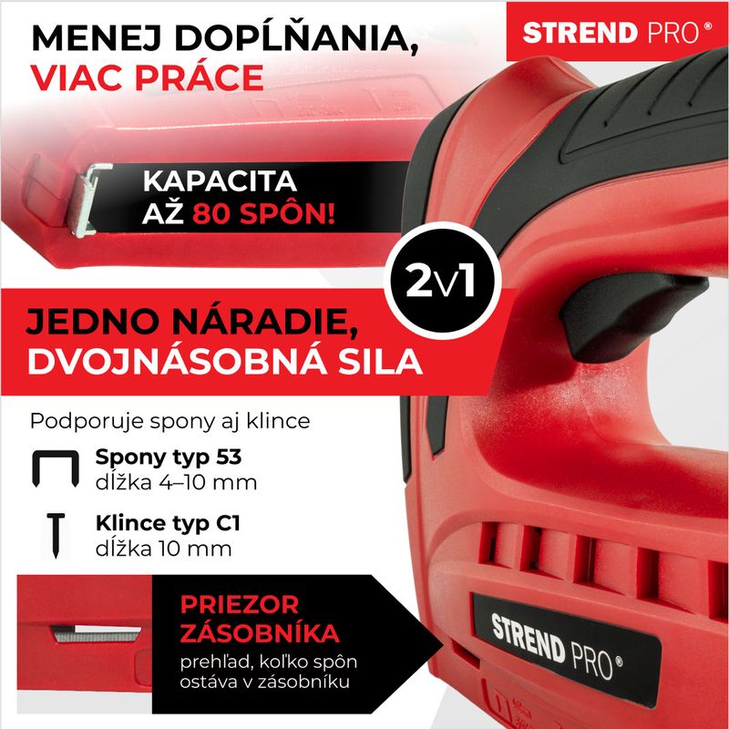 Akumulátorová sponkovačka Strend Pro je šikovný pomocník pre každého domáceho majstra ako aj do tvorivej dielne. Je ideálna pre čalúnenie nábytku, na dekorovanie, upevňovanie tenkých drevených materiálov, na renovačné práce. Sponkovačka má 2 funkcie – nastreľovanie klincov a zošívanie sponkami. Je vybavená LED indikátormi nabíjania, ukazovateľom stavu naplnenia a bezpečnostnou poistkou, ktorá chráni používateľa pred samovoľným vystrelením. Vstavaný Li-ion akumulátor umožňuje použiť sponkovačku kdekoľvek – pohodlne bez použitia káblov. Kadencia spôn/klincov za minútu: 30. Vhodná pre sponky typu 53 s dĺžkou od 8-14 mm a klince typu C1 10 mm. Kapacita zásobníka: 80.