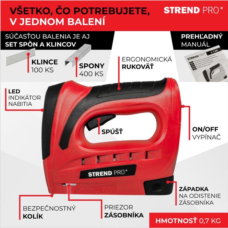 Sponkovačka Strend Pro J-126, 3,6 V, Li-ion, spony 6-10 mm, klince 10 mm