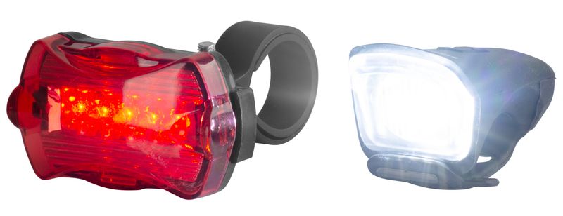 Predné svetlo je nabíjateľné cez USB kábel, do zadného svetla je potrebné pred použitím vložiť 2xAA batérie.