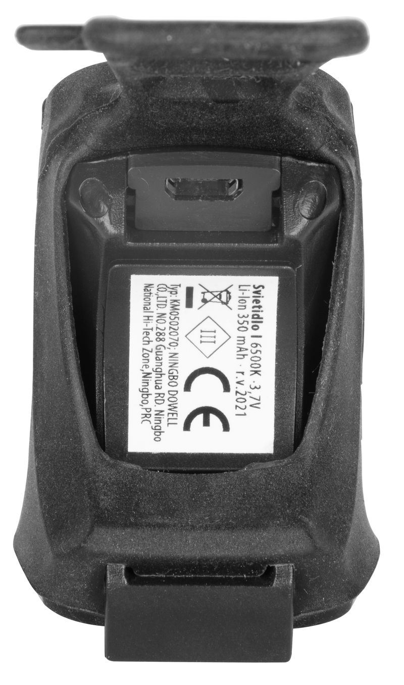 Príkon predného svetla je 3 W.Svetelný zdroj je XPE so svietivosťou 80 lm. Teplota farby je 6 500 K. Pri plnom výkone je doba svietenia 4 h. Krytie je IP44 a trieda ochrany je III. Je vyrobený zo silikónu+ABS. Jeho rozmery sú 60x38x37 mm. Má hmotnosť 33 gramov. Parametre akumulátora sú 3,7 V a 350 mAh. Doba nabíjania je 3 hodiny.